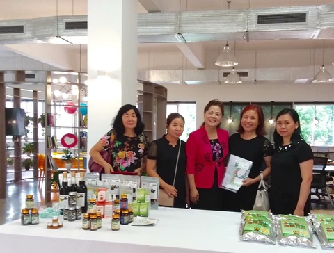 Một số sản phẩm của các nhà khoa học nữ chụp ảnh chung với chị Hồ Thị Quý, trưởng Ban hỗ trợ phụ nữ phát triển kinh tế