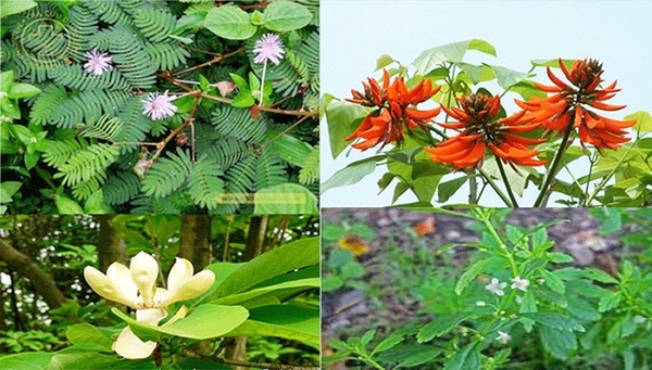 Các loại thảo dược (từ trên xuống, từ trái qua: xấu hổ, vông nem, hậu phác nam, cam thảo nam) được sử dụng để điều chế viên nang chống mất ngủ.