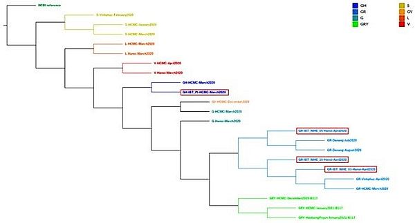 Cây phân loại cho thấy sự tiến hóa của SARS-CoV-2 cũng như thời điểm các chủng lần lượt xâm nhập vào Việt Nam